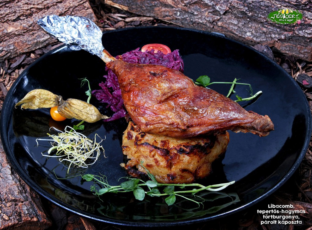 Crispy goose leg, crispy-onion mashed potatoes, steamed cabbage