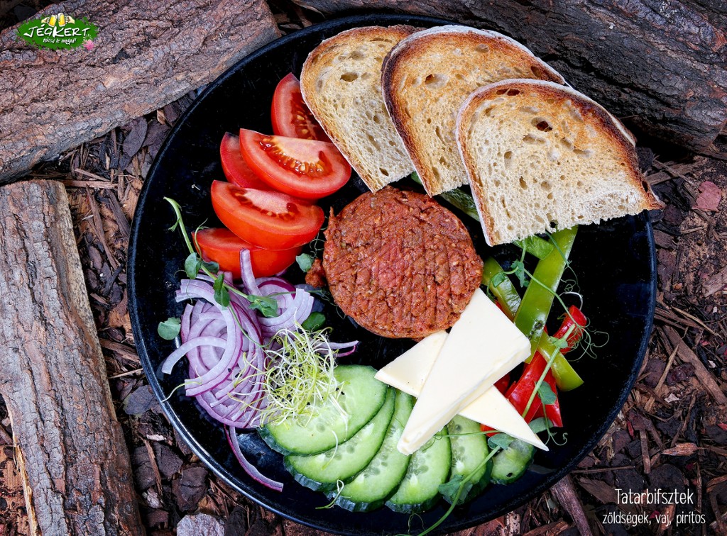 Tatárbifsztek, zöldségek, vaj, pirítós