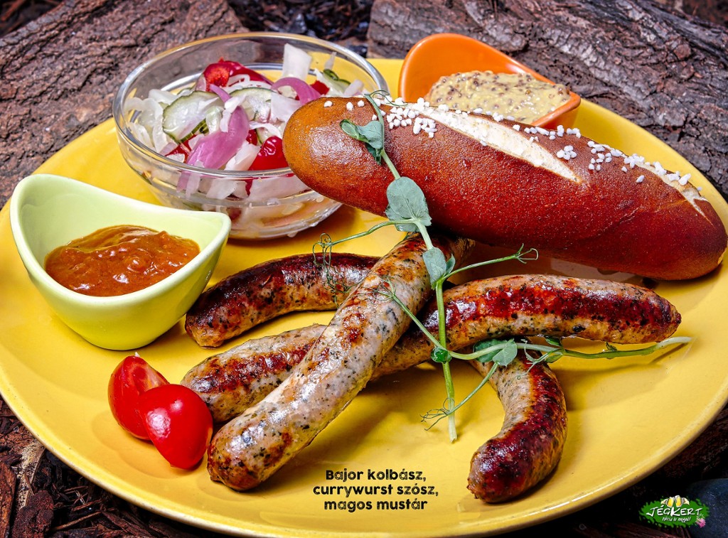 Bajor kolbász, currywurst szósz, magos mustár, vitaminsaláta, bagett